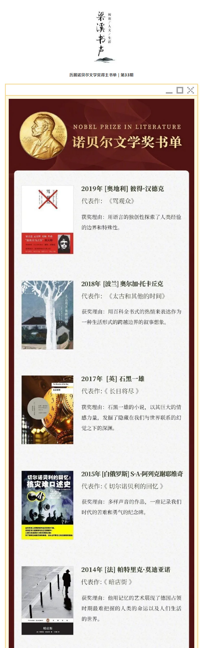 历届诺贝尔文学奖得主书单 | 梁溪书声