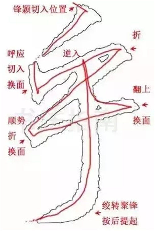 我们再仔细看看这个字的行笔轨迹和笔法点:
