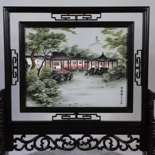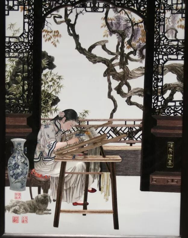 作为“女红”,千百年来均为实用品刺绣,以折枝花果、吉祥图案为主要题材,有戳纱绣(回文彩锦绣)、挑花绣、堆纱绣、列针绣等剌绣针法。剌绣家丁佩于清道光元年刊行我国第一部剌绣专著《绣谱》,书中写道:“昔年春日,舟过梁溪,斜照满山,风光成彩。”回家后立即用“退红绒参以牙色,绣成遥山一桁”,只见“山椒新绿成林,溪中碧水鳞次”,“顿觉耳目一新”,不禁自叹“此画家所未到也”。由此诞生“观赏绣”:一种格调高雅,充满艺术意趣的“闺阁中之翰墨”,世称“闺阁绣”。锡山绣工会将“闺阁绣”推向社会和商品市场,使锡绣名闻天下。