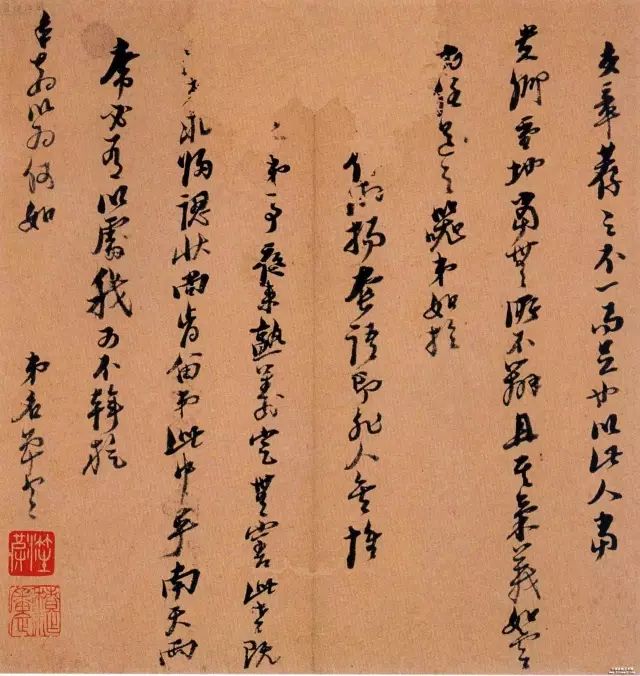 七、忌一字一蘸墨,笔均墨匀;重新起笔宜用浓墨,浓墨字的笔画特别要交代清楚。笔墨重的字不能面积相等,字的重轻要有过渡,无墨时也能看出字中有笔,最忌团状的模糊一片,使用涨墨犹须小心,不能一片狼籍,全无书卷气。