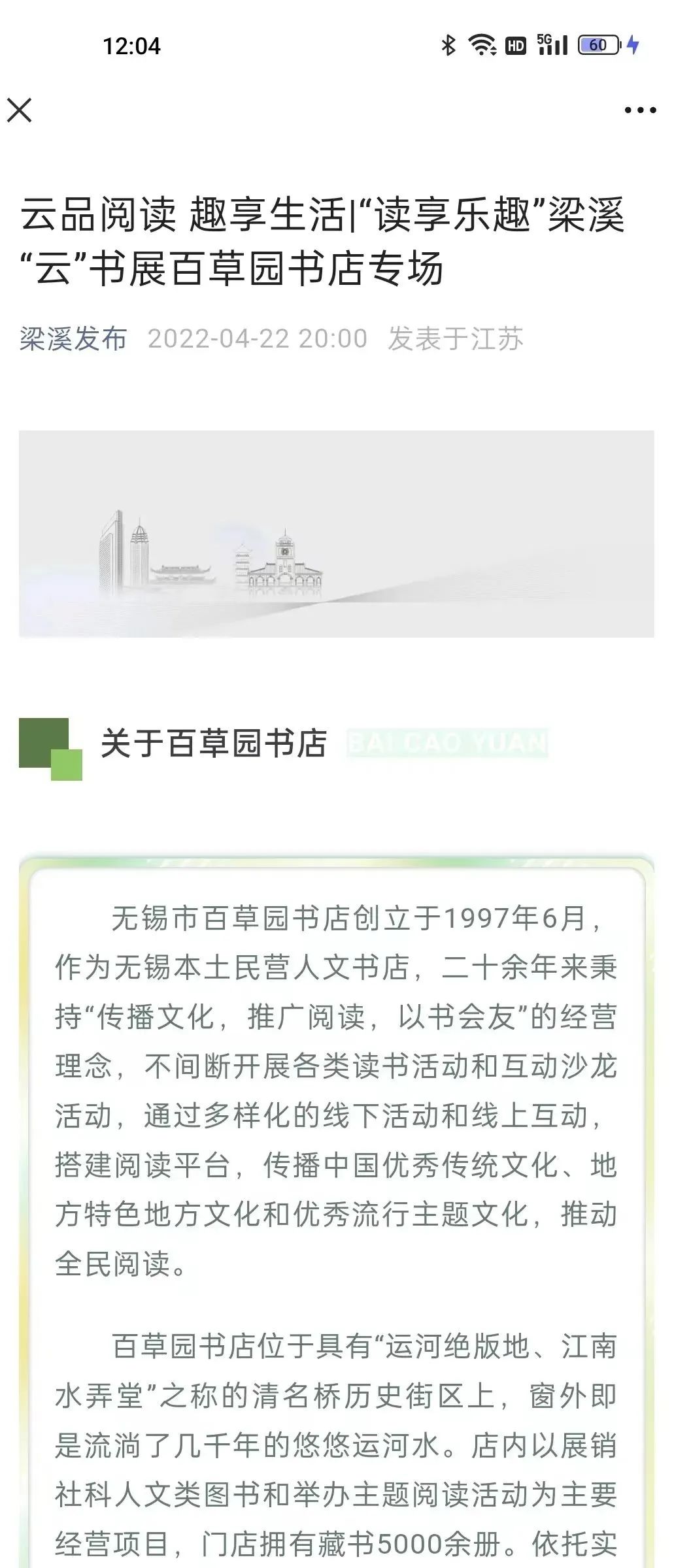 加大实体书店政策扶持引导,将书店打造成城市的精神地标。在《梁溪区“齐心抗疫”助企纾困稳定经济运行的若干政策措施》中专门添加给予实体书店补助的条款,面向实体书店发放行业纾困资金15万元。2022年“4.23”世界阅读日期间,在“梁溪发布”连续9天开展“读享乐趣”梁溪“云”书展,展示全区9家大型实体书店优秀图书资源,为企业开辟线上销售新途径。“五一”与元旦期间,邀请新华书店、钟书阁与大众书局参与梁溪云上购物节,通过直播平台发放总价值超过30000元的阅读红包。