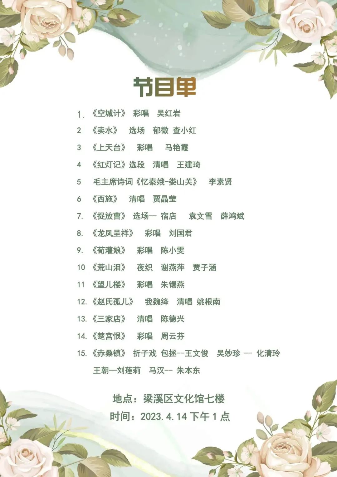 春满江南百花艳,国粹添香独一支。在这人间独美的四月锡城,由梁溪区文化馆主办,梁溪区文化馆京剧票友会和梁溪区文化馆京剧队承办的“幸福梁溪·相约有你”2023梁溪区特色文艺团队展演——《京剧专场》于4月14日下午1:00在梁溪区文化馆七楼剧场举办。