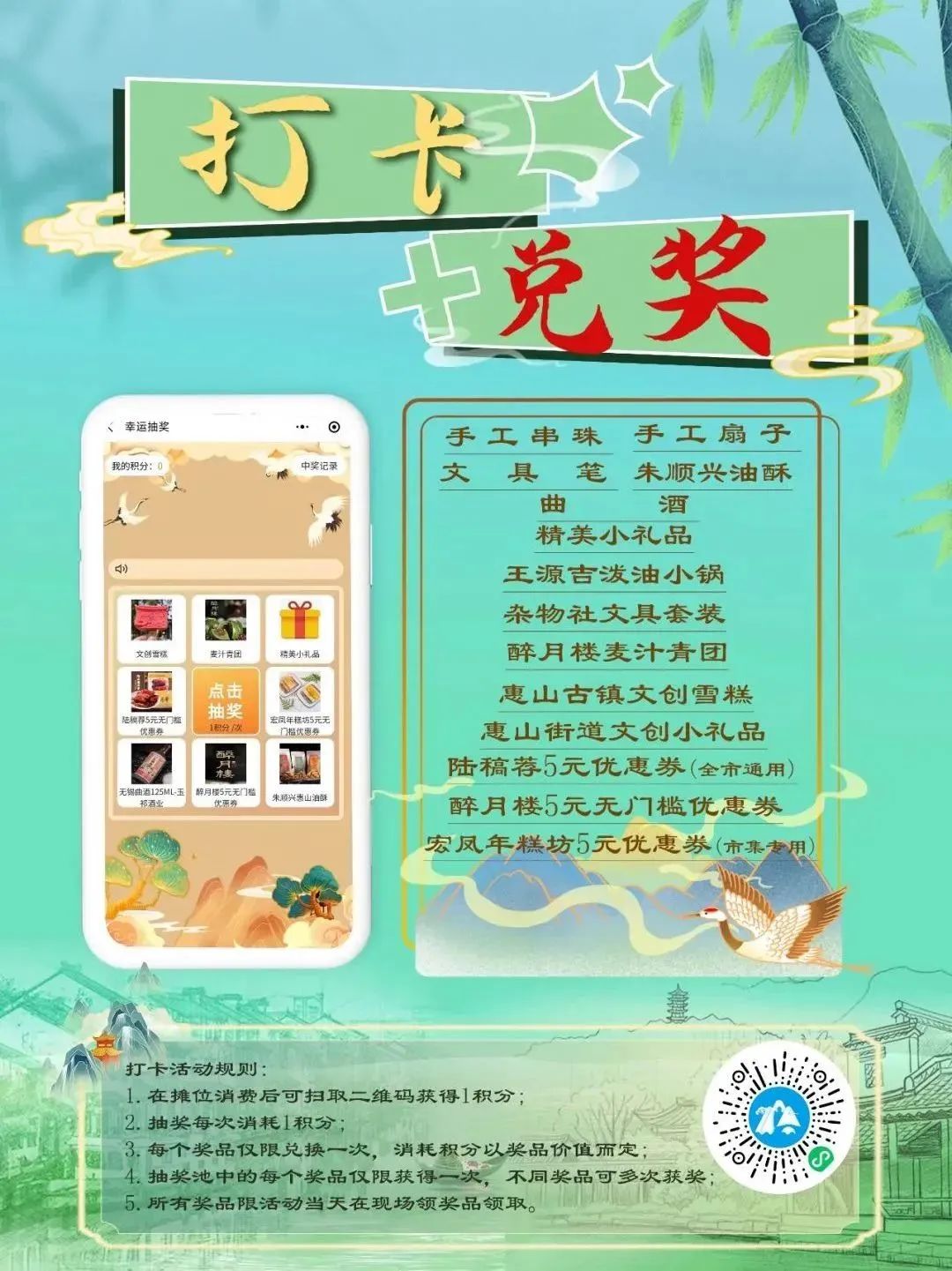 (注意事项:每次扫码可获1积分, 抽奖消耗1积分;抽奖池中每个奖品,仅限获得一次;不同奖品可多次获奖;所有奖品限活动当天在现场领奖点领取。)