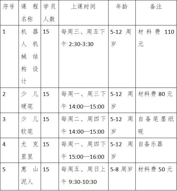 面向全市青少年,每人限报一门;每项课程报满为止。报名人数不满70%的课程将被取消。(需材料费的课程请学员在首次课程时交于老师。)