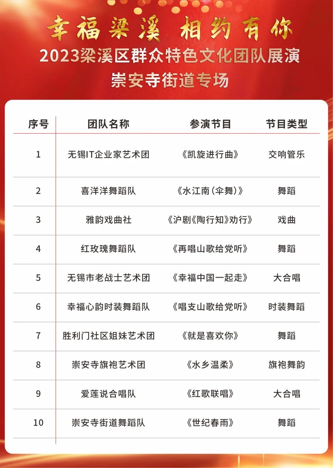长期以来,梁溪区文化馆始终坚持以“服务大众”为宗旨,不断提升文化服务创新力,充分给予基层群众特色文化团队展示平台和舞台,通过志愿服务、文化宣传、节目创作等各种形式助力城市文化,有效提升辖区人民群众的获得感、幸福感和安全感。