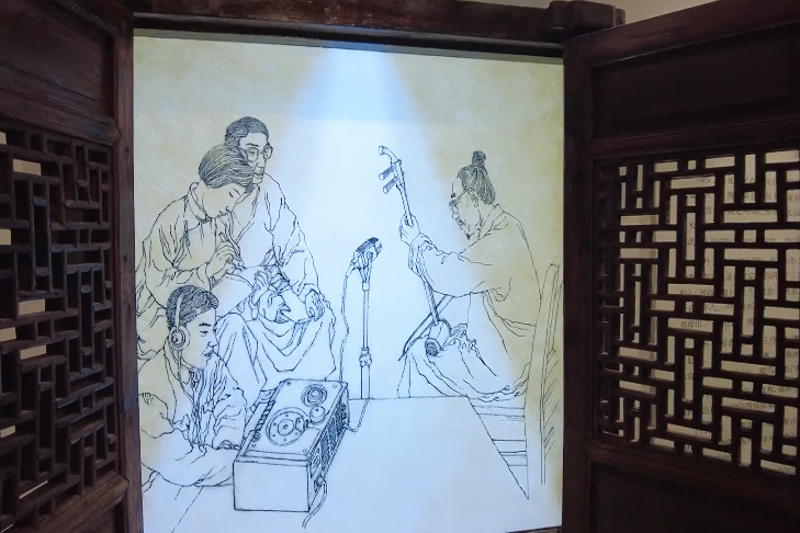 打开窗户,一幅屏风映入眼帘,展示了当时抢救性收录阿炳名曲《二泉映月》的名场面,这幅画面也是首次在阿炳故居中进行展示。