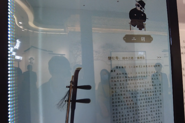 在一个透明展屏上,可以直观地看到一个二胡,点开屏幕,可以看到与阿炳相关的一些人物的故事,更加深刻地了解阿炳。