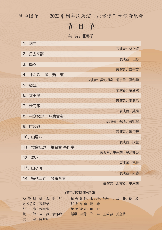 本次演出以意蕴高古的名曲《幽兰》开场,以赞美梅花和高尚情操的《梅花三弄》收尾,中有千古绝响《广陵散》,诗酒田园、山水写意的《山居吟》、《洞庭秋思》、《流水》、《山水情》和清丽哀婉、家国情怀的《长门怨》《捣衣》等,整台演出曲风各异,流派多样,有独奏,琴箫合奏,琴歌等多种表现形式,相信定能为观众带来一场视听盛宴。下面是琴委会和琴社演出的资料照片。