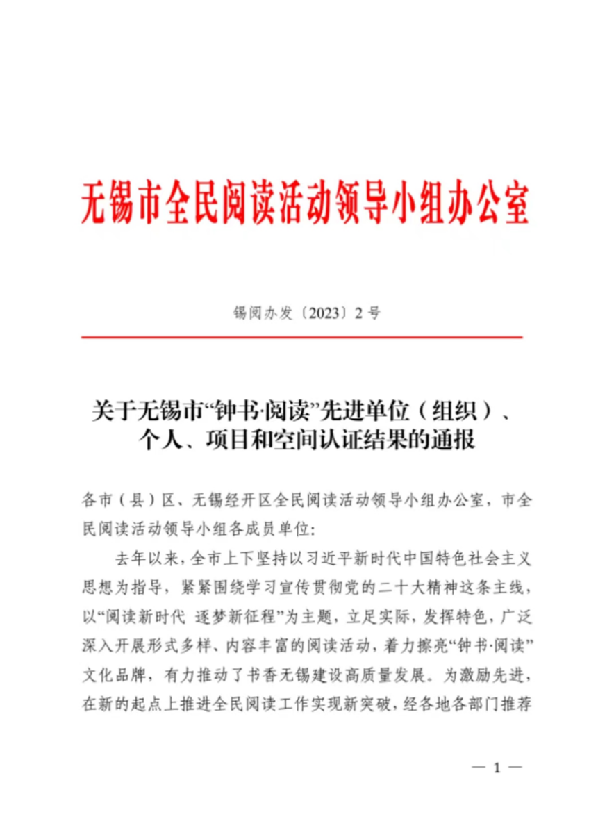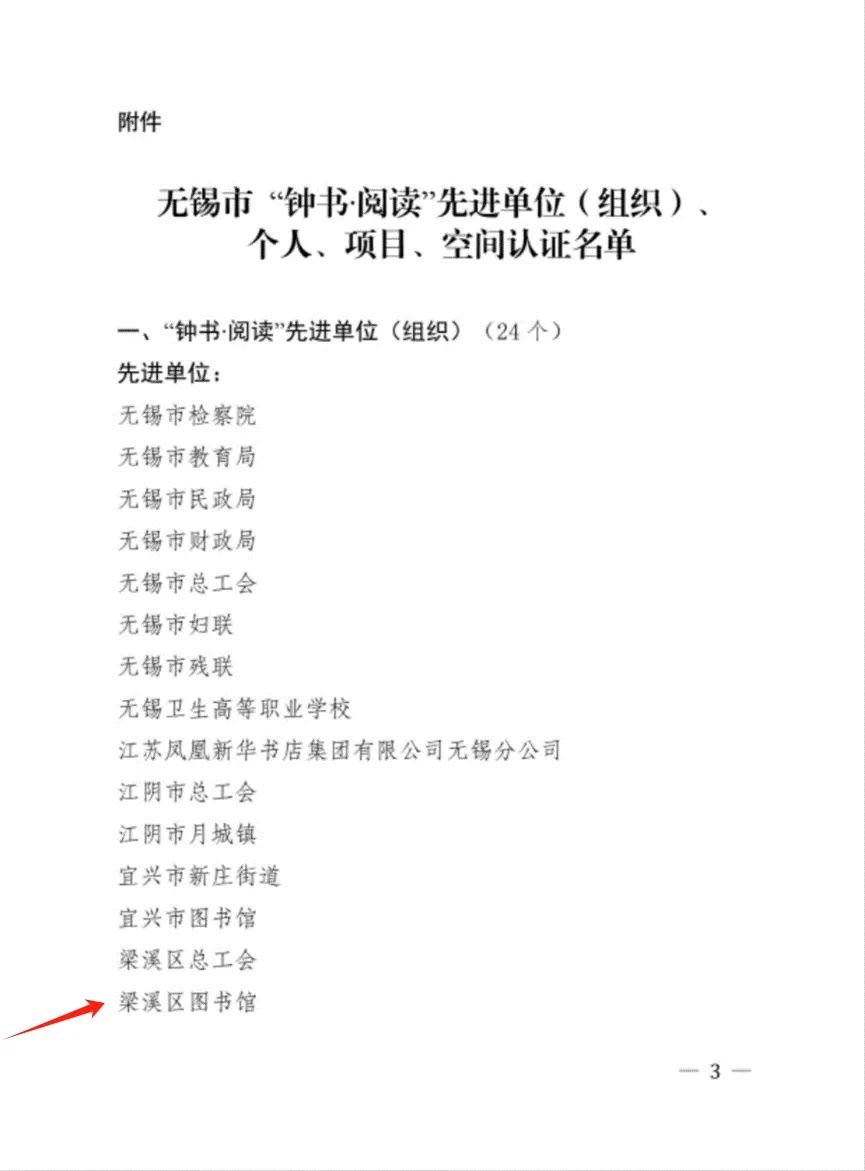 近日,无锡市全民阅读办公布了无锡市“钟书·阅读”先进单位(组织)、个人、项目和空间认证结果,梁溪区图书馆荣获“钟书·阅读”先进单位称号!