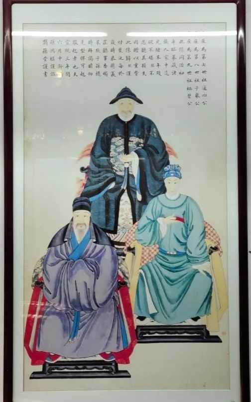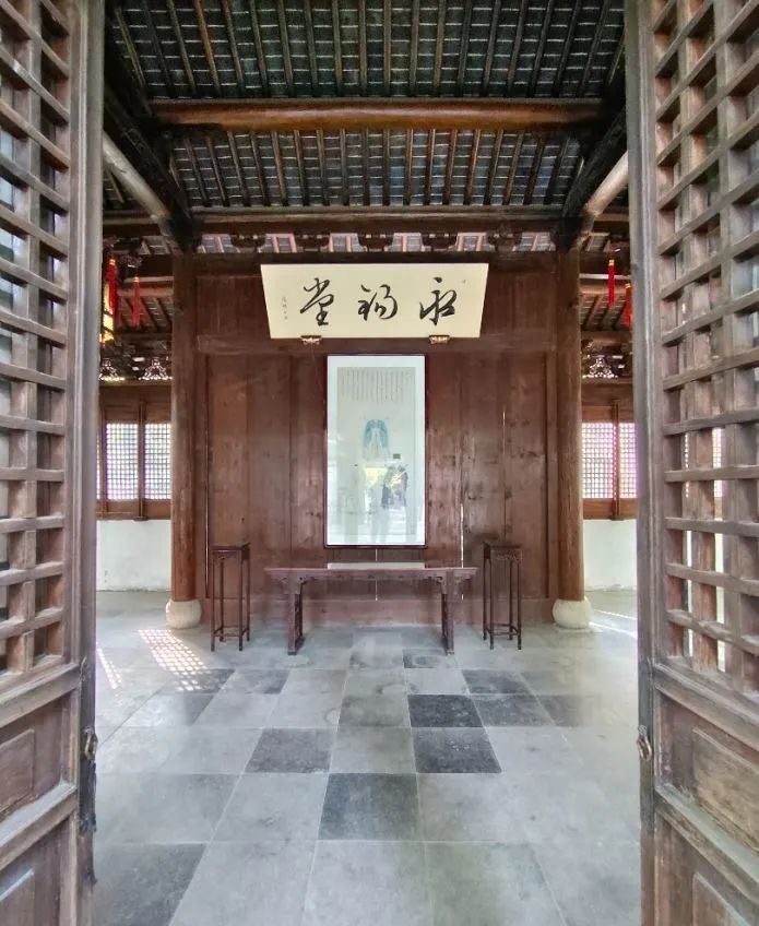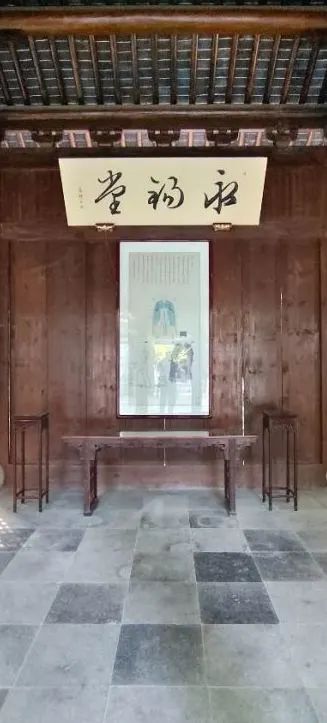 祠堂的大门采用传统的木质黑漆飞檐造型,中央的白底黑字牌匾彰显着孝道精神,而门边上的四块花岗岩设计则展现出恢弘大气的气息。走进正堂,会看到正堂上方悬挂着一块黄底黑字的“永锡堂”牌匾,下面挂着一幅家传三代的挂画,左右两边的墙壁上也各挂有两幅长卷壁画。