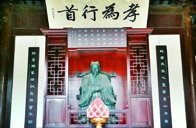 门帘后是一个宽敞的中庭,绿荫垂落,清澈见底的水井和池塘呈现出一个“品”字形排布,左右两边是连廊。往前走,是中堂,中堂上方悬挂着一块黄底黑字的牌匾,上面写着“孝为行首”,下面则是华孝子的贡台。前面还摆放着一张八仙桌。中堂左右的书卷上用黑底白字书写着华孝子的生平和高尚品德,让人心生敬意。再往前走,穿过石板路,便来到内堂。内堂里供奉着华孝子家族的灵位,代代相传,祭祀祈福。