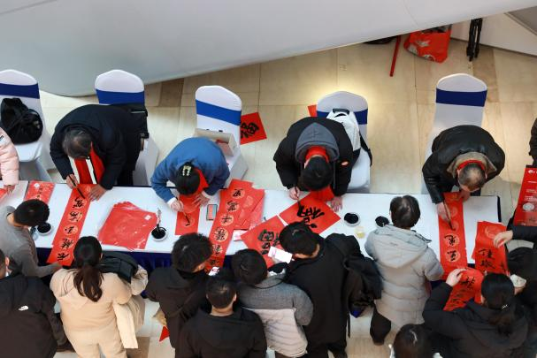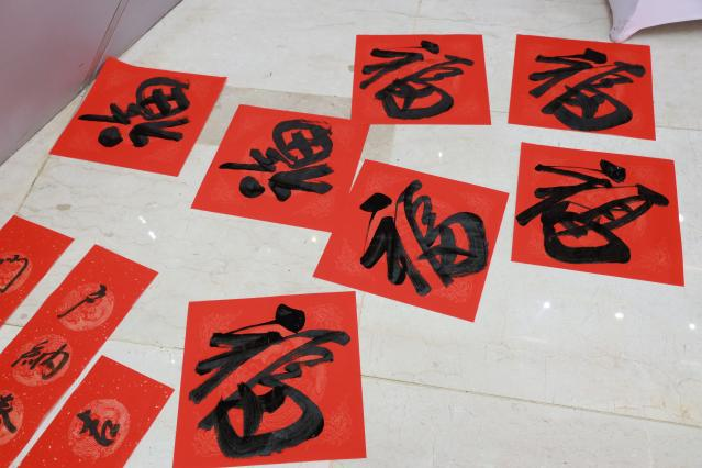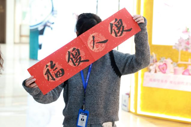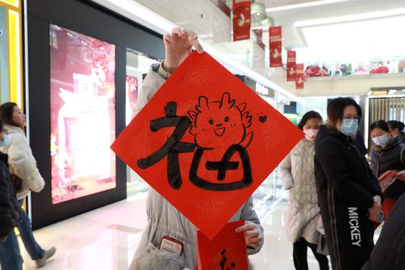 户外寒风凛冽,商场内却是暖意融融。活动开始,赵铭之、巫忠兴等书法家现场铺纸运笔,挥毫泼墨。“福”笔盈香,书以载福,一个个气韵生动,发抒由衷祝福之情。当一幅幅充满喜庆、吉祥、祝福的春联和一张张不同形态、神采飞扬的“福”字展现在大家面前时,全场一片欢声赞语。这些精美作品递送到在场居民手中,个个心中充满获得感和幸福感。