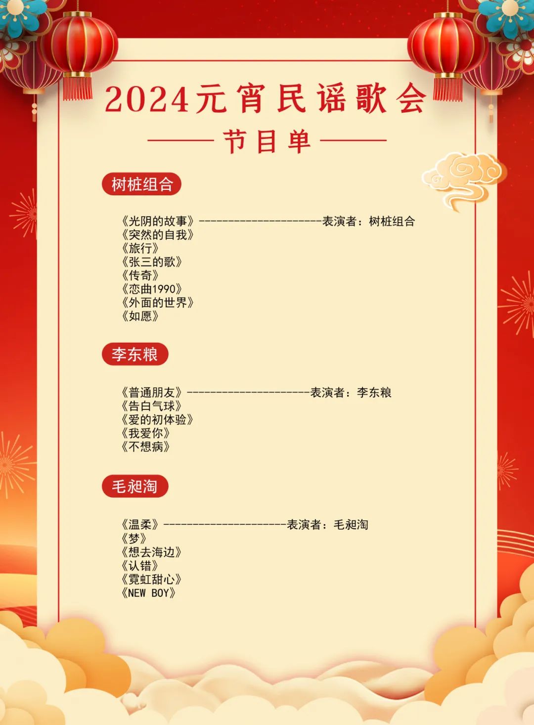 演出曲目:光阴的故事、突然的自我、旅行、张三的歌、传奇、恋曲1990、外面的世界、如愿