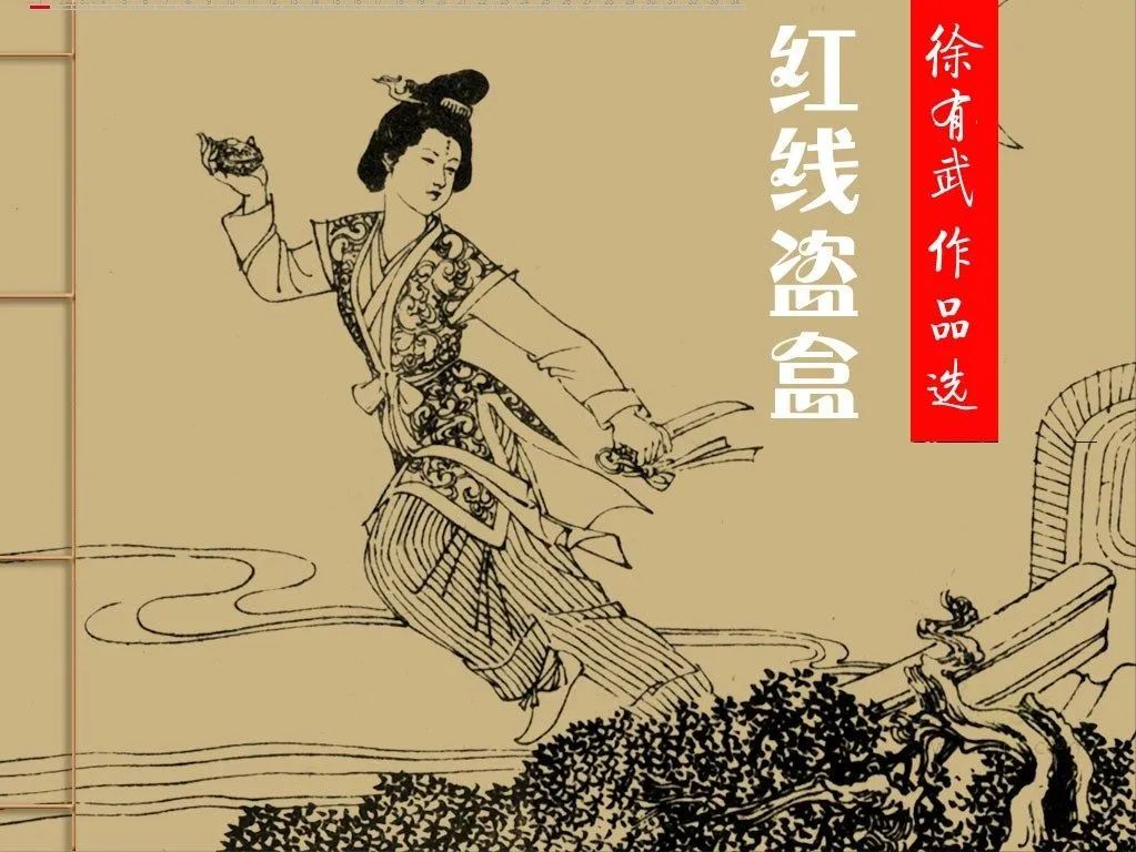 连环画《红线盗盒》取材于唐代袁郊传奇小说《红线传》。魏博节度使田承嗣欲吞并潞州节度使薛嵩之地,薛嵩很忧虑。薛嵩的侍婢红线有神术,自告奋勇往田承嗣处探听,给予警告。正值田承嗣睡卧,红线本欲行刺,后改盗金盒而返。田承嗣派兵追来,又为红线所败。红线将金盒献于薛嵩,薛嵩修书一封,连同金盒还与田承嗣。田承嗣大惊,知薛嵩有强将,自己不是对手,于是与薛嵩修好。红线辞别而去,不知所踪。