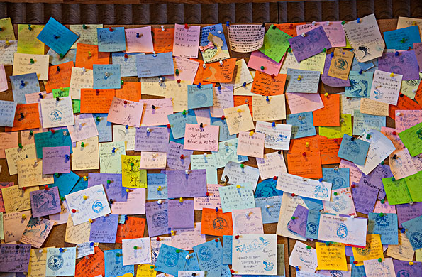将购买过的咖啡或图书小票挂在社交区打卡墙上