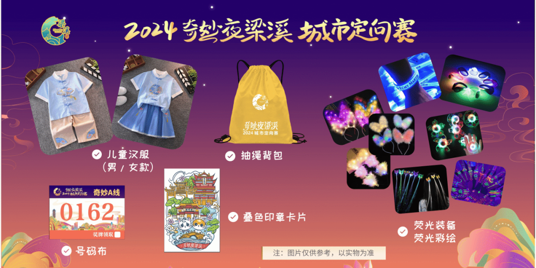 ● 小朋友装备:儿童汉服(男款/女款)、号码布、叠色印章卡片、荧光装备(旋转陀螺戒指灯、七彩手环、超闪鞋夹灯、发光头箍/发光蝴蝶辫)、抽绳包。
