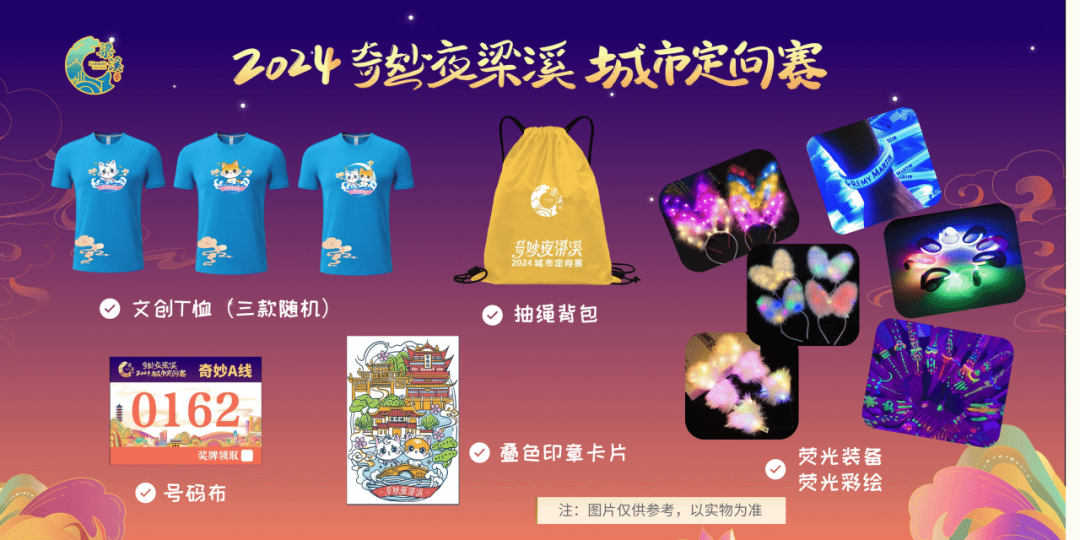 ● 成人装备:文创T恤、号码布、叠色印章卡片、荧光装备(七彩手环、超闪鞋夹灯、发光头箍)、抽绳包。
