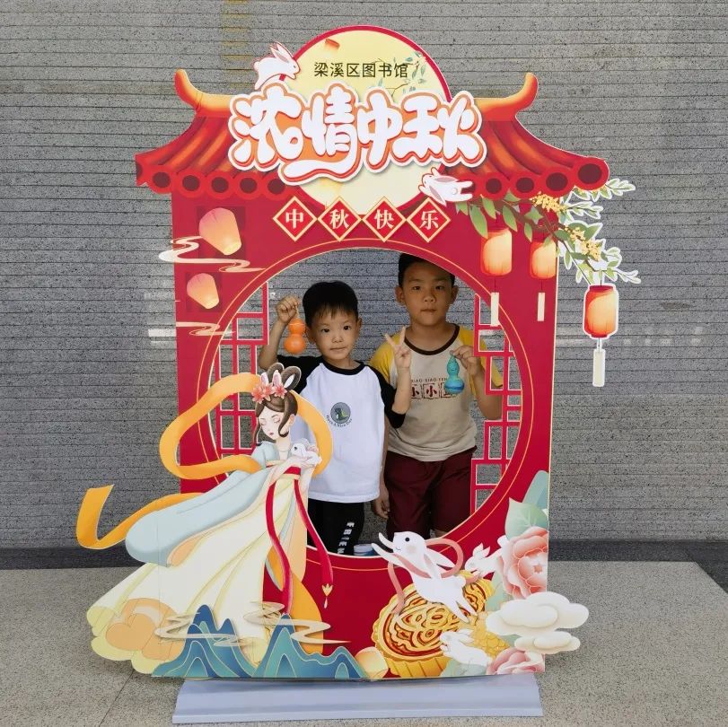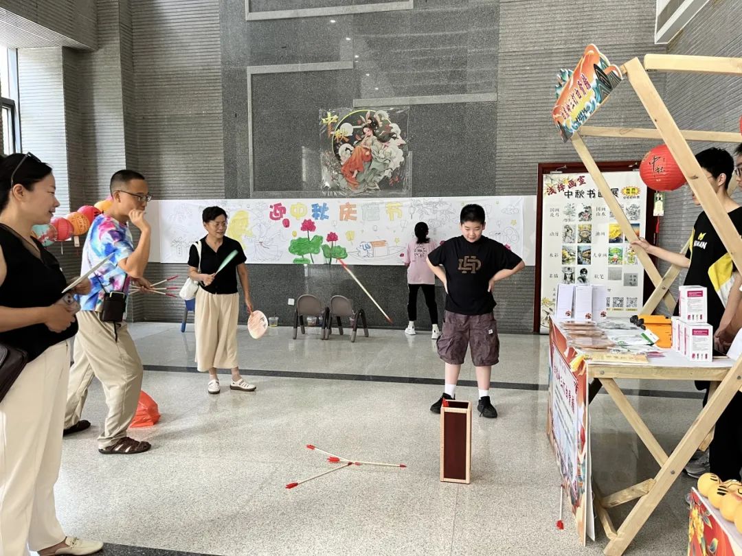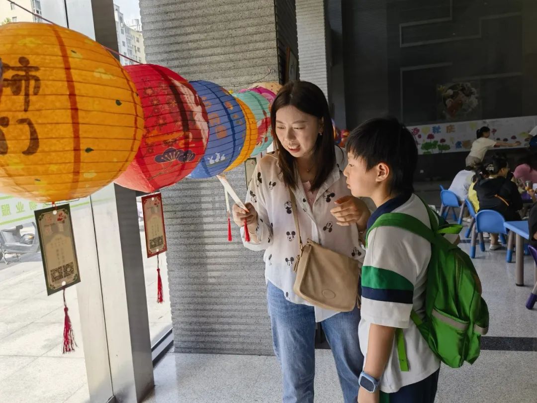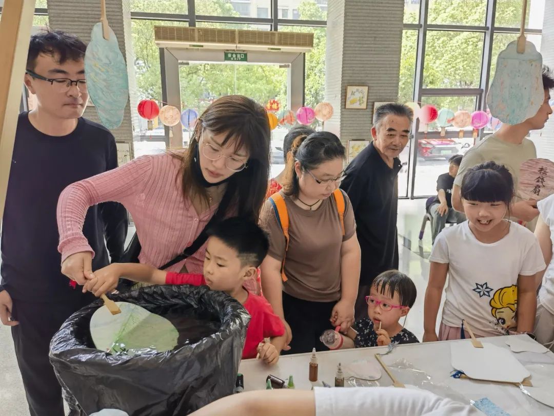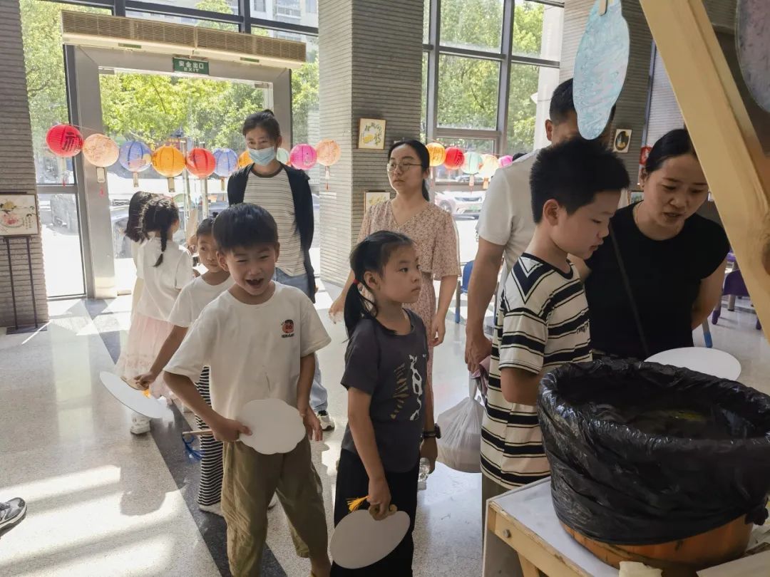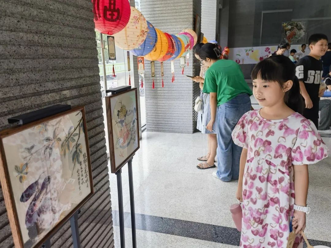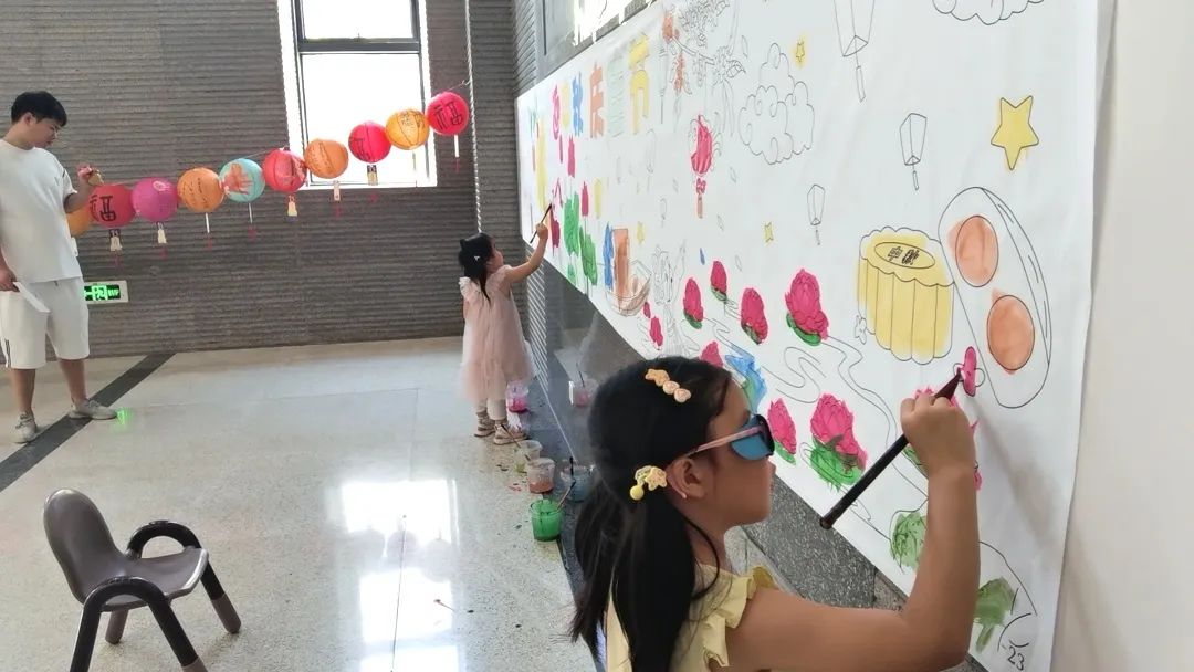 除此以外,现场还有来自浅绛画室的中秋画展,看这金菊绽放,花好月圆,画出了美好人间;更有“迎中秋、庆佳节”大型贴画,现场的孩子们群策群力,为大家传递了多彩的美好祝福。