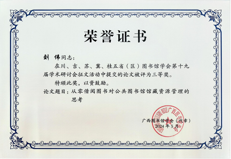 近日,川、吉、苏、冀、桂五省(区)图书馆学会第十九届学术研讨会征文活动评审结果公布,梁溪区图书馆馆员刘伟的论文《从零借阅图书对公共图书馆馆藏资源管理的思考》荣获三等奖。