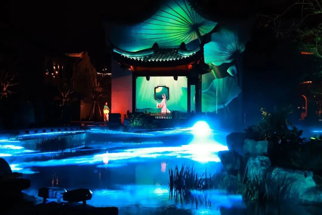 作为本届展演主会场,惠山古镇在活动期间安排的演出形式多样,除了剧场演出,每日更有多场露天的快闪式音乐演出在街区进行。当夜幕降临,上河塘附近光影交错,岸边少女提灯寻觅,上演一场乾隆游船下江南,偶遇琵琶女献乐的柔情故事。现场游客被场景式演出吸引,纷纷拍照记录这美好时刻。