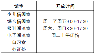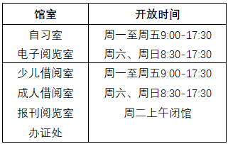 寒假即将开始,为方便广大学生读者到馆借阅,从1月15日起至2月12日,特对梁溪区图书馆总馆少儿和成人借阅室、民丰馆综合阅览室开放时间做出调整。其间1月28日至29日(大年夜和年初一)大楼电力检修,闭馆两天。