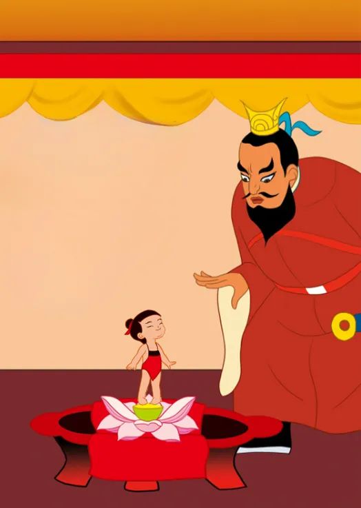 李靖疑惑地来到夫人的房间,只见地上的盆中放着一个粉色的莲花苞。“啊!”李靖瞪大眼睛说:“生下这么一个东西,恐怕不是个好兆头”说着,他抽出腰间的宝剑就向莲花苞劈去。只听叮的一声,莲花苞一瓣一瓣地绽开了,一个身穿红肚兜的小男孩儿从莲花中站了起来。