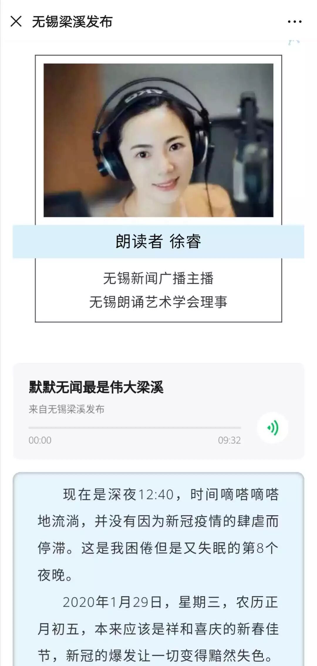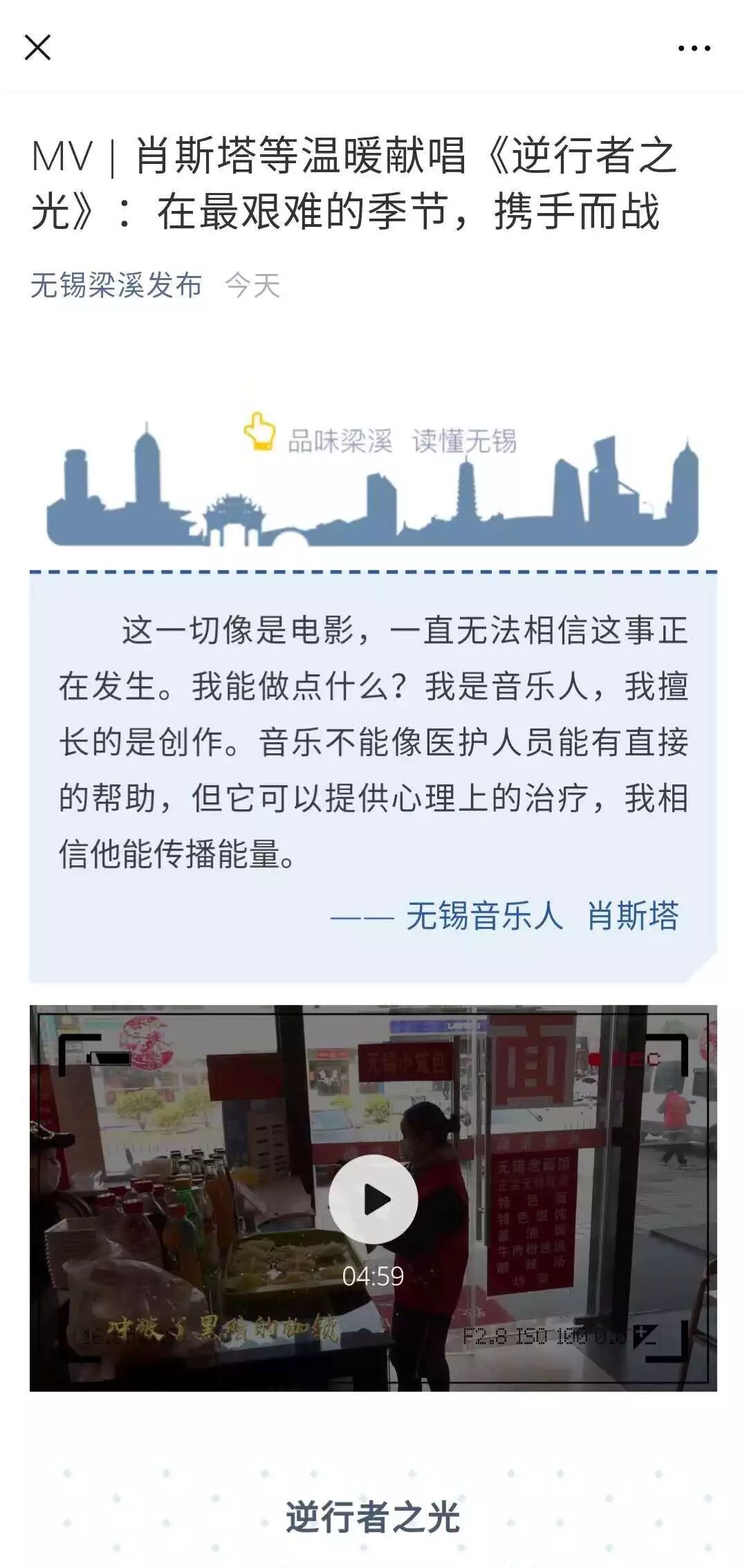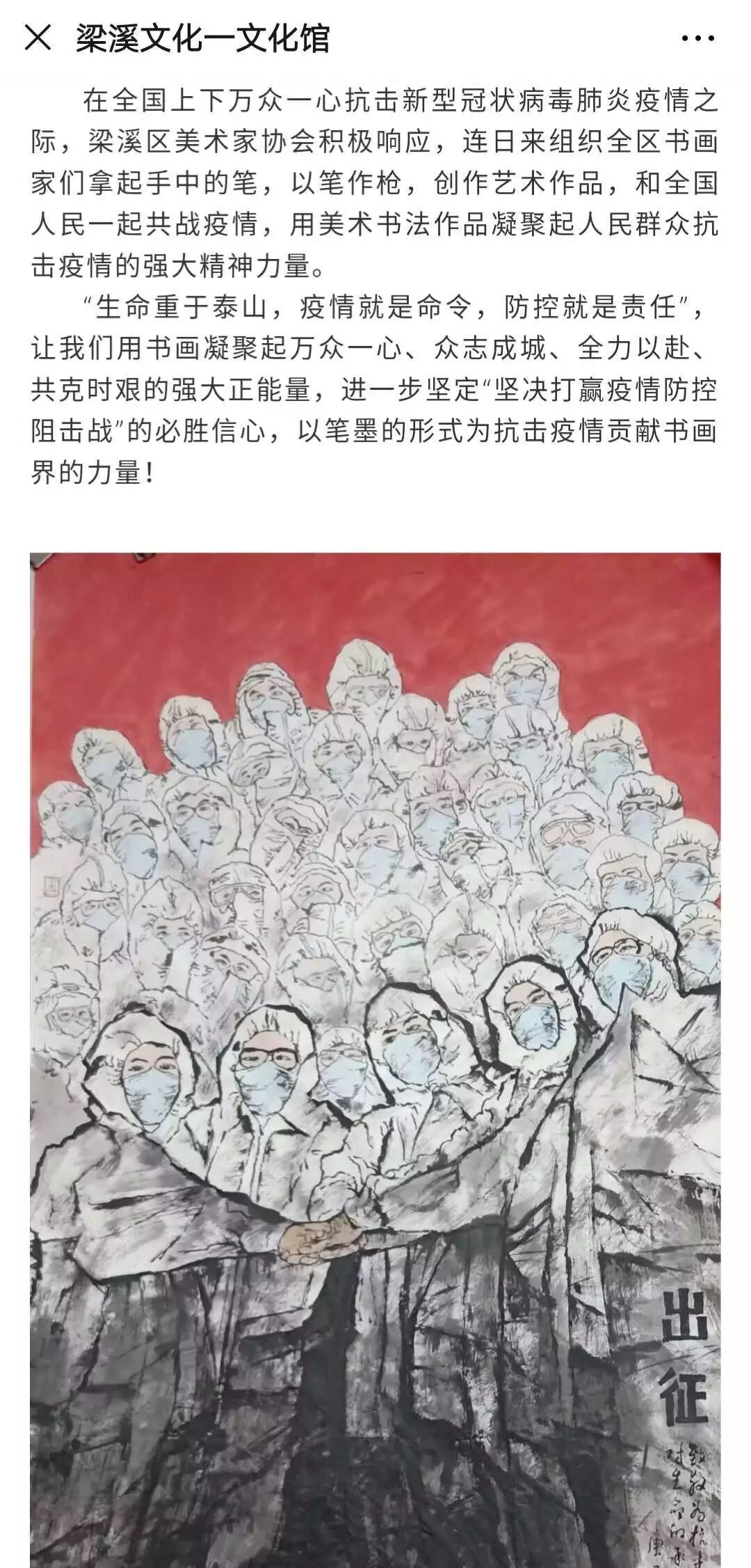 为打赢疫情防控阻击战,梁溪区的文艺工作者和文化志愿者们认真落实区委区政府疫情防控工作要求,主动担当作为,积极投身创作,用文艺的形式记录在疫情防控中涌现的最美人物和动人故事,弘扬广大疫情防控工作者的无畏精神和奉献精神。区文体旅游局、区文化馆联合无锡市朗诵学会、区美术家协会、鹏之翼语美工作室、无锡极简音乐工作室等社会组织,广泛发动肖鹏、徐睿、肖斯塔等40多位区文化志愿者的力量,紧紧依托街道文化站的力量,已推出文化战“疫”作品106件,进一步凝聚人心,鼓舞斗志,为武汉加油!为中国加油!