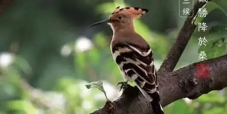 此时,可以看见戴胜飞临桑树枝头。戴胜虽然叫起来不甚悦耳,可满身的漂亮羽毛却能吸引人的眼球:头上的羽冠长而阔,呈扇形,宛若一顶皇冠。