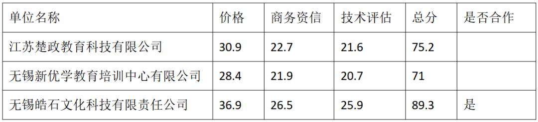 截止报名日,我馆根据活动策划方案择优选择三家单位进行现场评比,分别为:江苏楚政教育科技有限公司、无锡新优学教育培训中心有限公司、无锡皓石文化科技有限责任公司。2022年12月6日,我馆就“招募阅读公益活动合伙人”项目召开比价比方案会议并进行现场评估打分,现将结果公示如下: