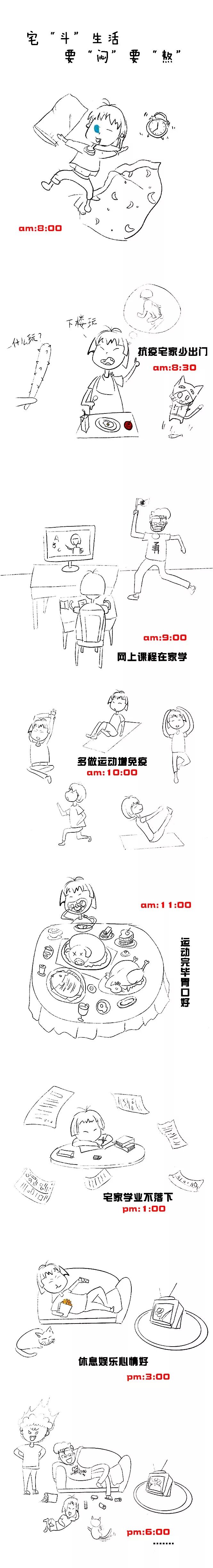 在全民宅家期,网上纷纷表示被憋的很蓝瘦的相关话题直接被顶上了热搜榜,宅在家的日子你们都是怎么过的?来自广益街道文化站的文艺志愿者李佳妮,以宅在家里的小学生女儿为原型,创作了一个条漫,简易诙谐的手法将小姑娘宅在家里的生活剪影展现在人们眼前,令人捧腹的同时也向大家展示了非常时期普通人的日常生活,为紧张的抗疫战线添上一丝轻松与安慰。