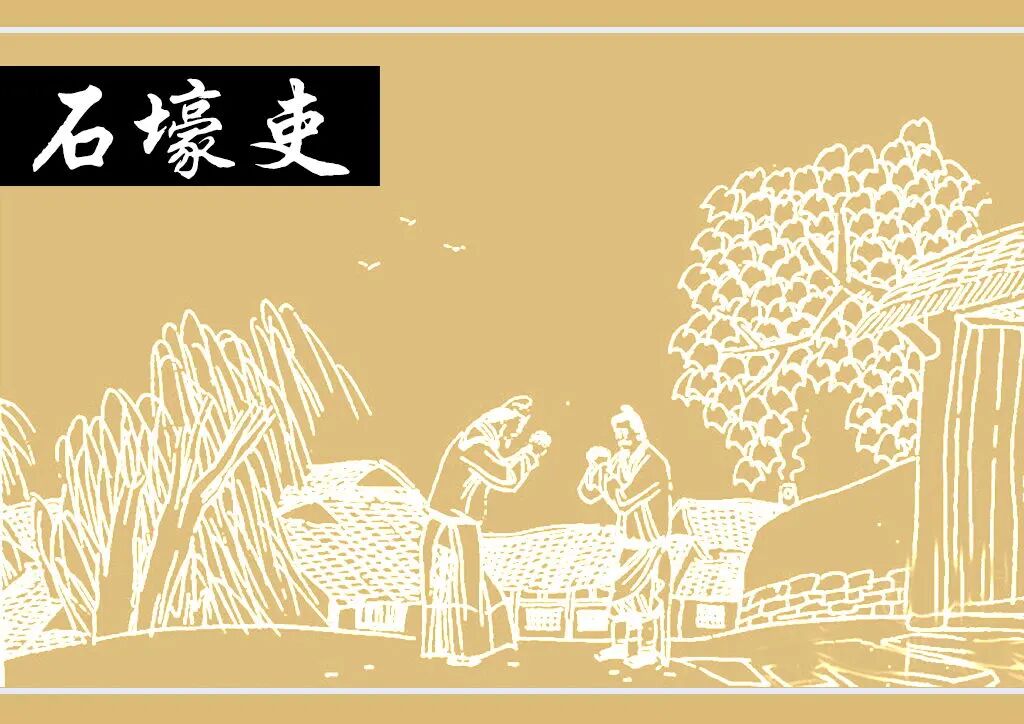 连环画《石壕吏》改编自唐代诗人杜甫同名诗作,讲述了杜甫途经石壕村目睹老妇被抓差的故事。唐肃宗乾元二年(759),河阳之战结束后不久,杜甫前往华州,路过石壕村借宿老妇家。夜间县吏敲门抓差,要求老妇家出人,老妇哭诉三子已征、两子战死,老翁逃亡,只剩儿媳与孙子。县吏不允,老妇无奈应允随行,杜甫听后彻夜难眠。战乱中百姓的悲惨遭遇使他写下了《石壕吏》这一流传千古的诗篇。
