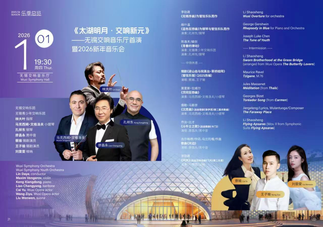 以湖光月色为韵,以交响新声为魂,既是无锡交响音乐厅的首度亮相,亦是一场礼赞新年的艺术盛宴。既有世界交响名作的恢弘磅礴,亦有浸润江南韵味的灵动旋律,在首演舞台上交织成跨越国界的音乐盛宴,开启新年崭新序章。