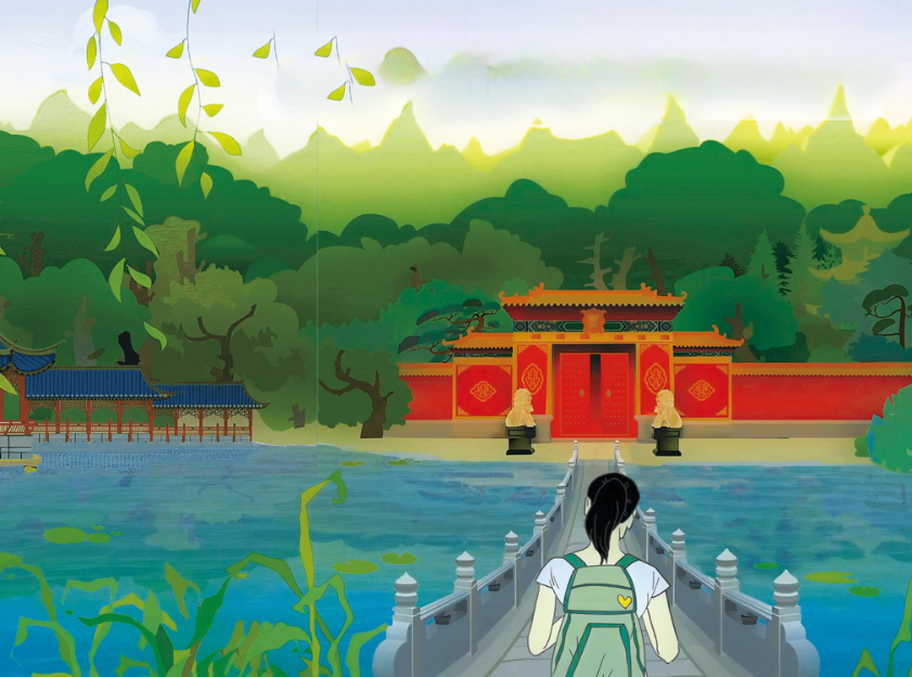 虹虹推开窗,外面是一片清澈的湖水,远方能看见翠绿的群山。