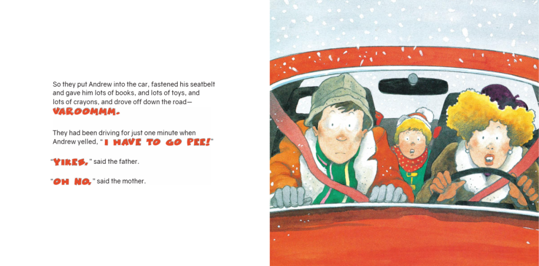 于是,他们把 Andrew放进车里,给他系好安全带,又给了他很多书,很多玩具,还有很多蜡笔,然后车子就开走了——轰——