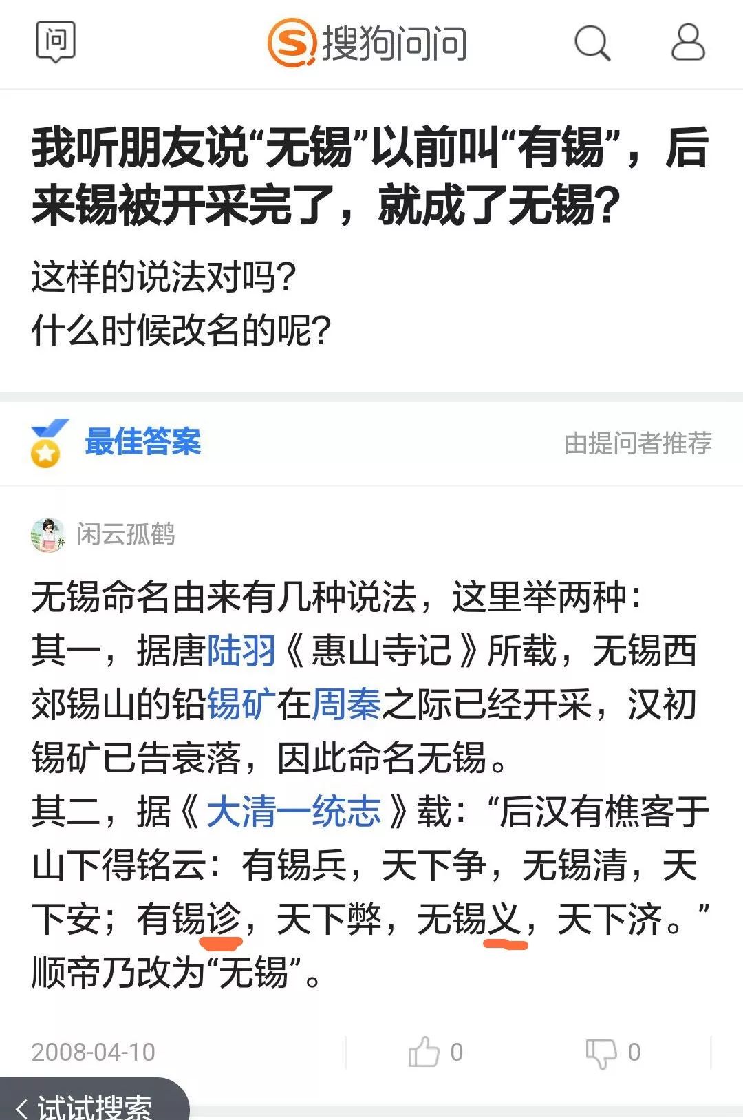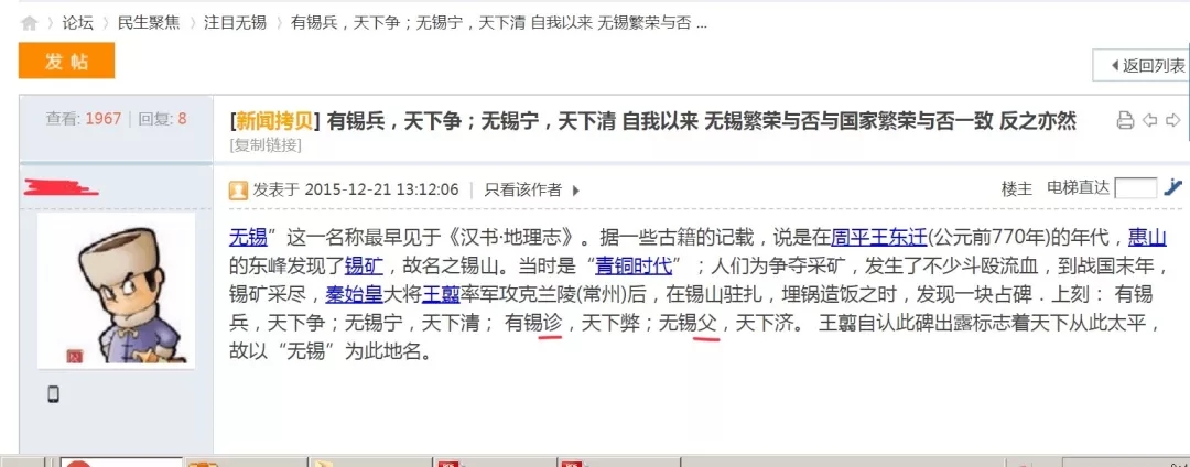上网搜索“无锡地名的由来”“无锡是怎么得名的”等词条,在百度知道、百度贴吧、东林书院论坛、搜狗问问等地方果然看到了“有锡诊”“无锡父”或“无锡义”等字样