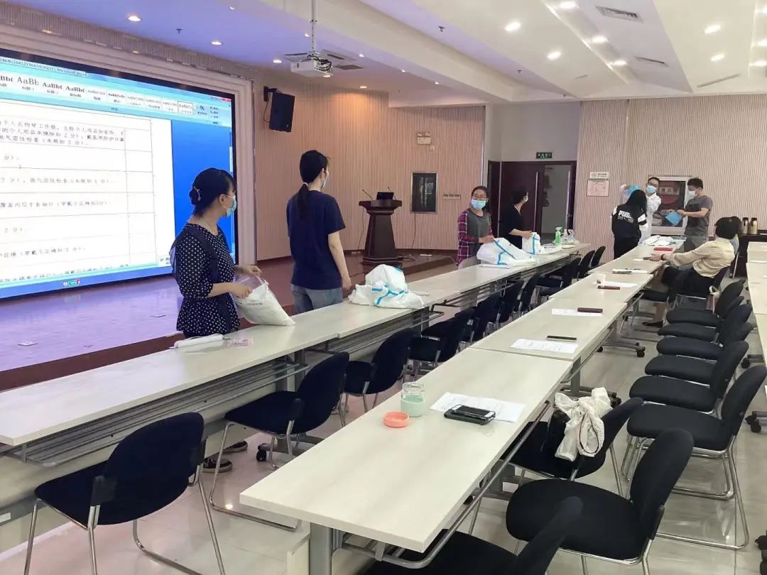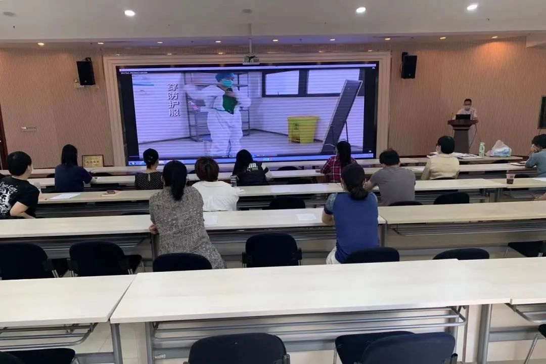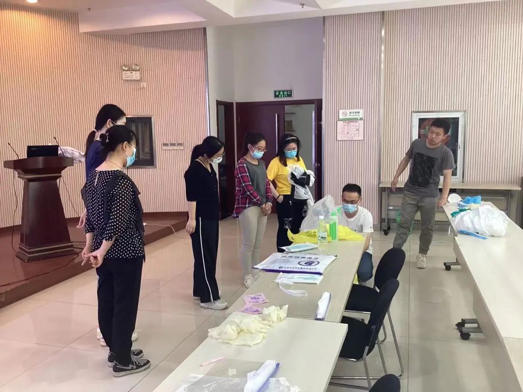 理论讲解后,大家还在现场进行了防护服穿脱,医生在旁边观察并指出大家的不规范之处。比如时刻注意手消毒,脱的时候尽量不要碰到里面的衣服,防护服往下卷等。