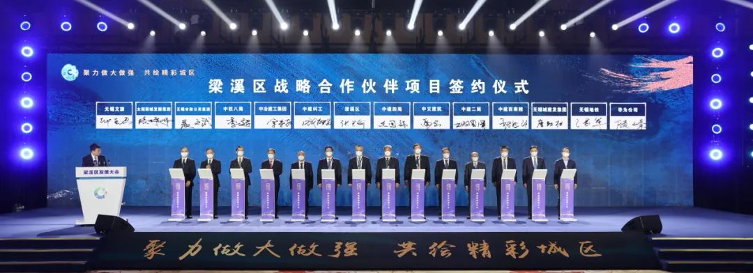 会上,梁溪区与中建四局、华为集团等重点央企、知名民企签约结成战略合作伙伴,涵盖产业园区、商贸服务、文化旅游、人工智能、大数据、都市工业等多个领域的102个项目集中签约,总投资518亿元。