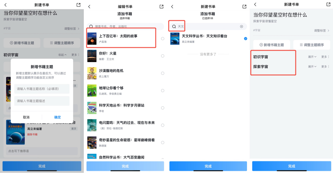 (1)创建知识书单:添加知识书单主题->添加书籍主题名称->添加书籍->完成