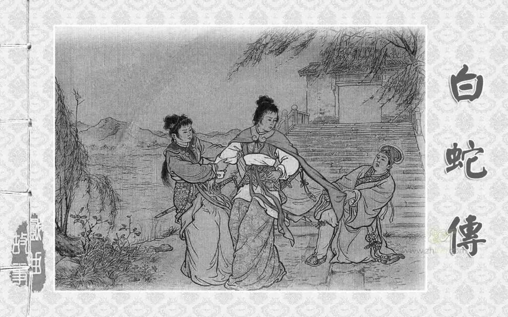 连环画《白蛇传》改编自经典传统剧目,讲述了白素贞与许仙的爱情故事。南宋绍兴年间,在峨眉山上修行的白、青二蛇因羡慕人间生活,化身白素贞和小青来到西湖,并与药店伙计许仙相遇。白素贞与其互生爱慕,经小青撮合结为夫妻。许仙、白素贞夫妻与小青来到苏州开店,生活美满。金山寺僧法海百般破坏,白素贞与之斗法,被压雷峰塔下。小青学得武功,摧毁雷峰塔,救出了白素贞。