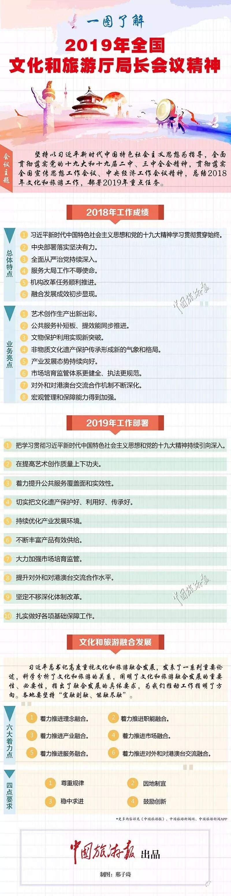 1月3日至4日,2019年全国文化和旅游厅局长会议在北京召开。文化和旅游部党组书记、部长雒树刚作工作报告。他认为,2018年我国文化和旅游工作推进有力,实现预期目标,各项业务工作亮点频频;2019年,文化和旅游工作要做好10个重点任务。此外,雒树刚还就文化和旅游融合提出了具体的要求。