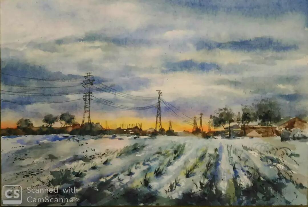 陈奕如 〈雪地农田〉 水彩/纸本