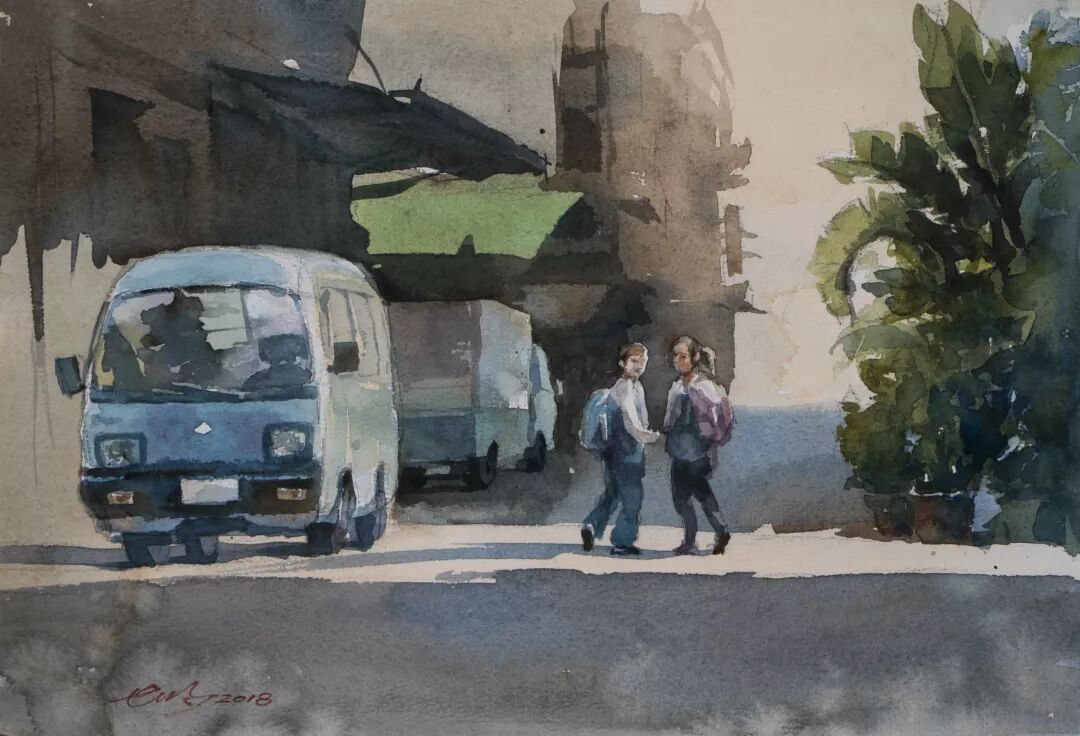 陈世明 〈下课后 (台南神农街)〉 水彩/纸本