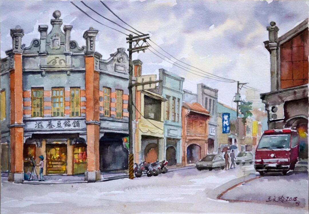 王文玲 〈廸化街涼卅街口〉 水彩/纸本