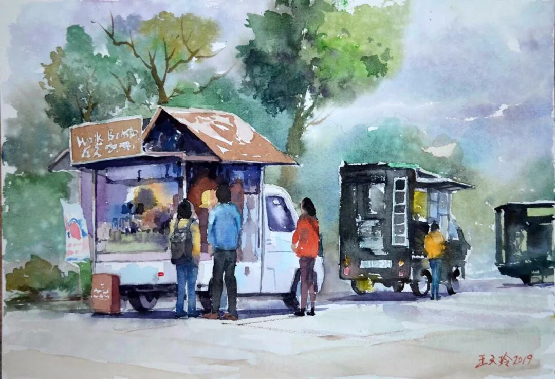 王文玲 〈三重空军一村的餐车〉 水彩/纸本