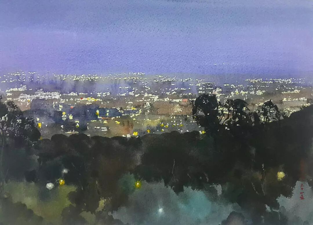 简来喜 〈万家灯火〉 水彩/纸本