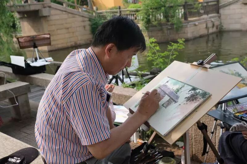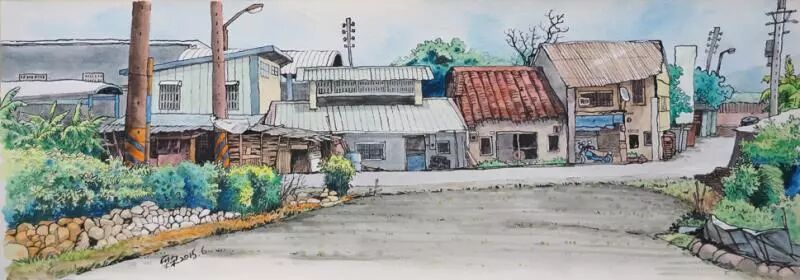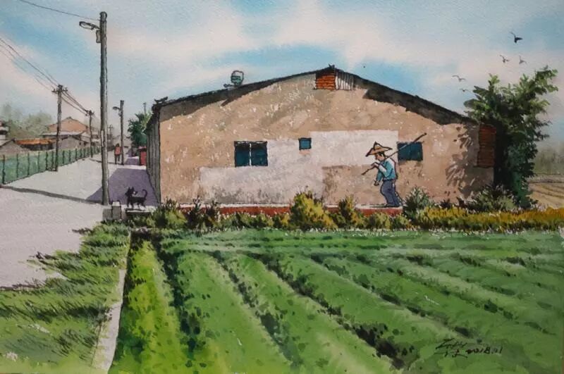 他的作品以枯枝笔勾勒线稿,再以水彩颜料铺色的方式表现,这种创作方式给人舒缓轻松、含蓄婉转,朴素雅致的视觉感受。作品大多描绘阳光照射下宁静的乡村风景及一些日常的生活场景,画面线条肯定、流畅,色彩清新明亮。欣赏他的作品,给人空灵、高远、凉爽、清静超脱、远离世俗的感觉。