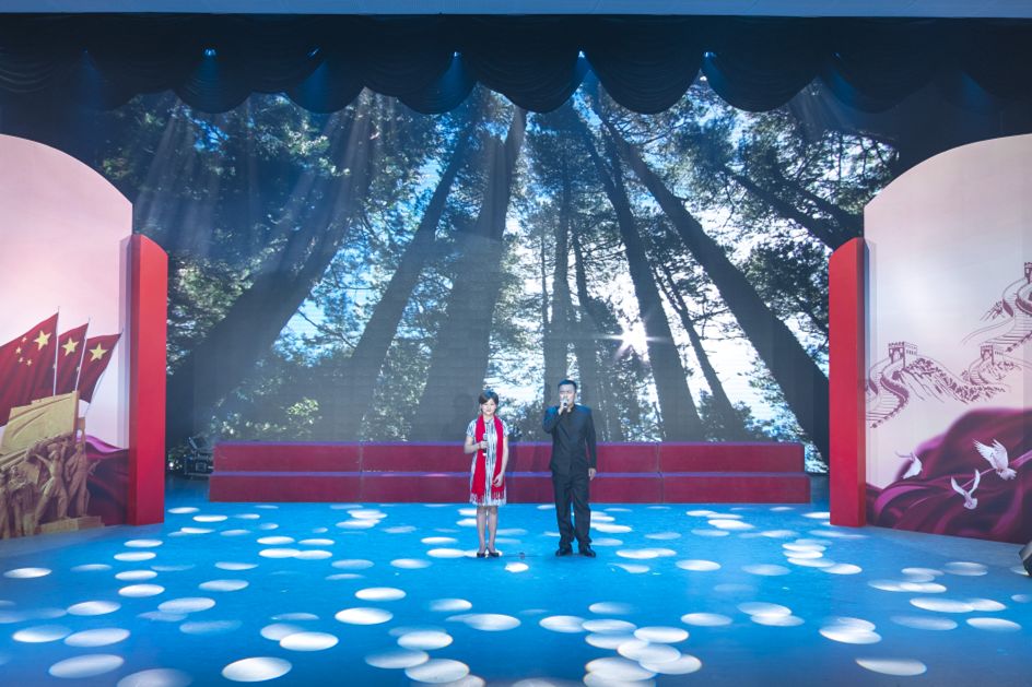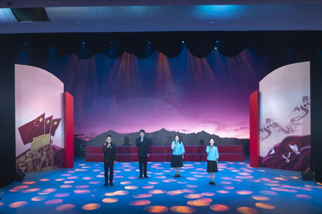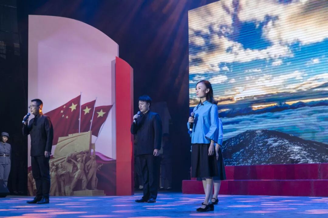 △区教育局教师艺术团的四位老师们共同朗诵《可爱的中国》。在最困难的年代,以方志敏为代表的共产党人没有放弃信仰和斗争,正是因为他们,国家才有了希望。
