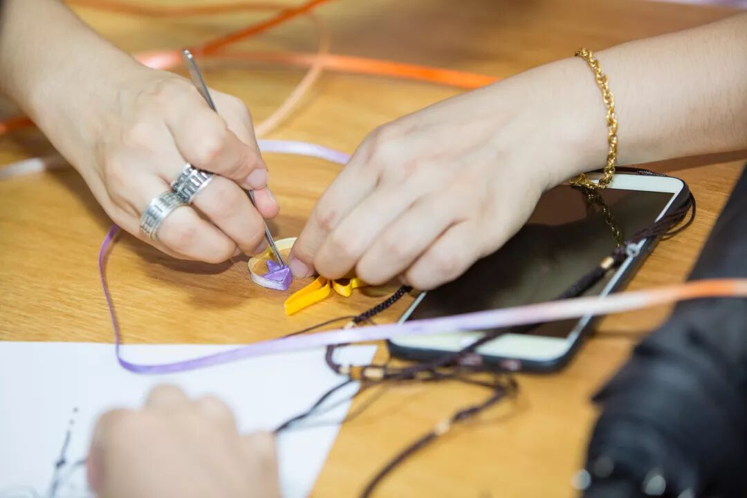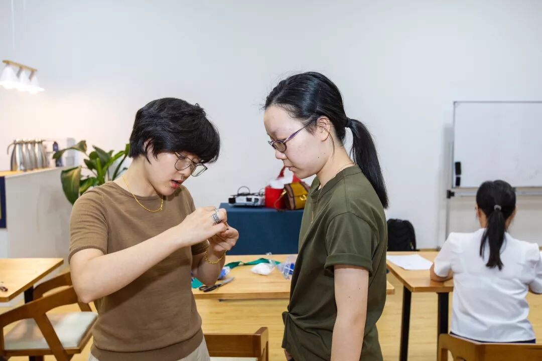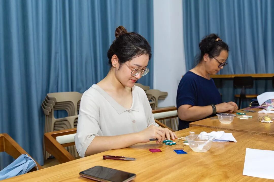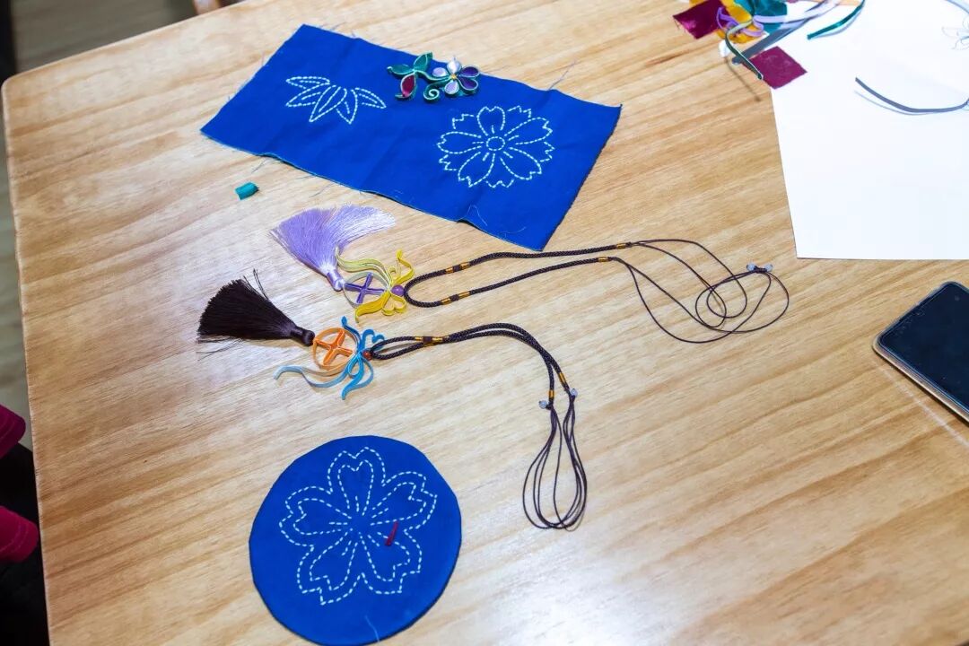 在盘扣制作课程的现场,老师耐心指导着,学员们纷纷静下心来学习。绳线在学员们的手中逐步变样,最终成为充满中国艺术特色的盘扣。