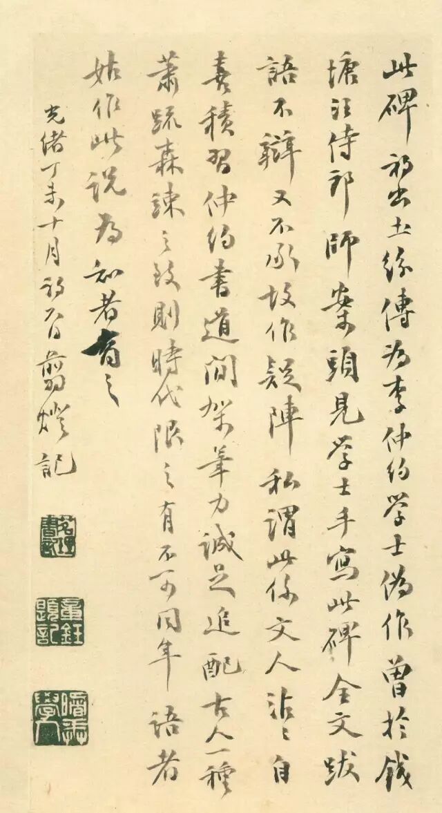 此志出土后,即由知县张荣升在第三十一行“文曰”的“曰”字之下加刻跋文二行;此后跋文又被人凿去,在整纸拓本中,可以清晰见到凿痕。存世拓本依次可分为:初拓无跋本、有跋本、凿跋本,初拓本“文曰”下有三芝麻大小点横列於下,石面光滑无损。因张荣升刻跋后不久即被凿去,故有跋本较初拓反倒少见。