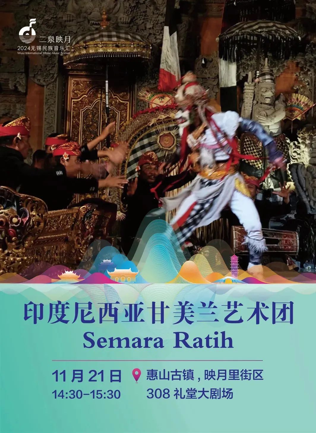 Gamelan(甘美兰)是印度尼西亚历史最悠久的一种民族音乐形式。音乐和舞蹈在甘美兰这种艺术形式中紧密交织,以至于甘美兰这个词通常包括舞者和音乐家。甘美兰乐器主要由打击乐器组成,大多数被调为五音或七音音阶,印度尼西亚爪哇岛和巴厘岛的甘美兰最为著名。Gamelan Semara Ratih成立于1988年10月28日,由来自巴厘岛南部的顶级音乐家、作曲家、舞蹈家和编舞家组成,艺术团成立后不久即闻名于巴厘岛,随即受邀赴丹麦、日本、德国、比利时、荷兰、美国、加拿大、土耳其等国家演出。